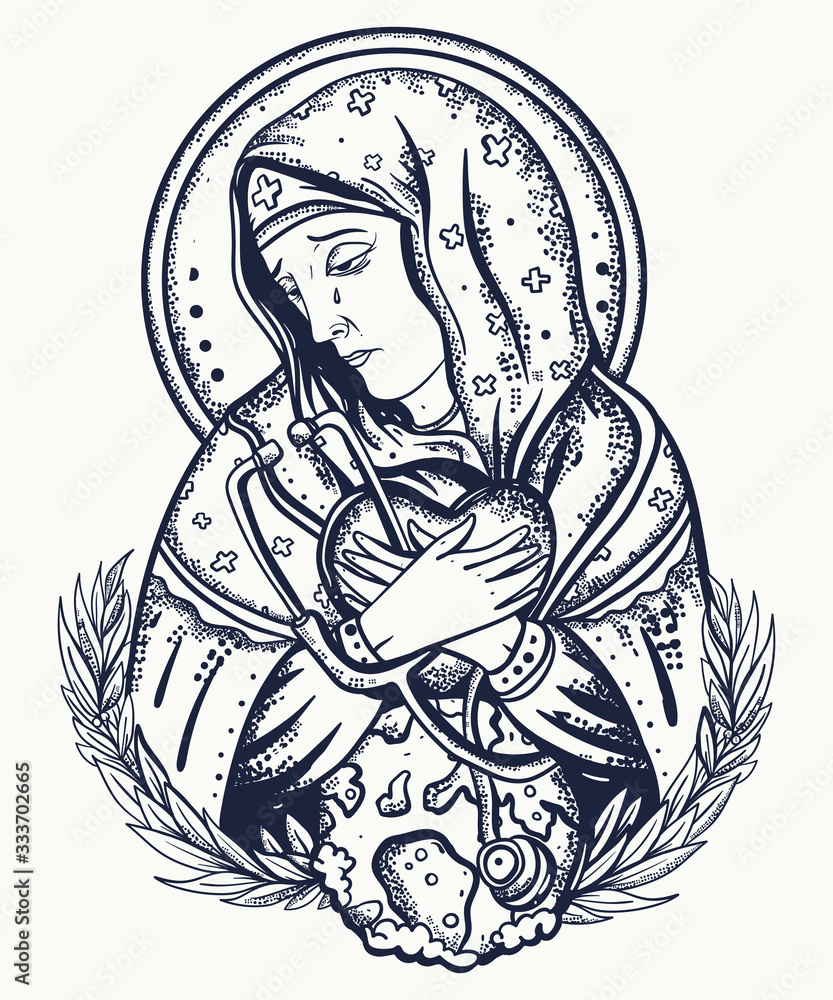 Coronavirus Art Old School Tattoo Stop Epidemic Doctor Virgin Mary Prays For The Addition Of The Epidemic Covid 19 Thanks To Doctors Of The World Stay Home Background Icon Painting Style Stock Vektorgrafik Adobe